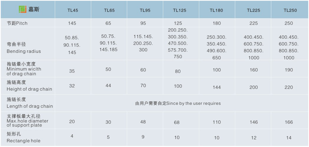 JS.106005 TL型鋼制拖鏈 Tl系列拖鏈的主體是由鏈板(優(yōu)質(zhì)鋼板鍍鉻)支撐板(擠拉鋁合金)軸銷(合金鋼)等部件組成,使電纜或橡膠管與拖鏈之間不產(chǎn)生相對運動,不產(chǎn)生扭曲變形,鏈板經(jīng)鍍鉻處理外形效果新穎,結(jié)構(gòu)合理,靈巧強度高,鋼性好不變形,安裝方便,使用可靠,易拆裝,尤其是本產(chǎn)品采用了高強度耐磨材料,合金銅為軸銷,提高了產(chǎn)品的耐磨強度,彎曲更靈活,阻力更小,降低了噪音,從而可保證長時間使用不變形,不下垂。 由于本產(chǎn)品外觀精美,可在較大程度上增強機床設(shè)備的整體藝術(shù)美觀效果,增強我國機床、機械設(shè)備在市場的競爭能力。 1.拖鏈可適應(yīng)移動速度40米/分。 2.拖鏈在移動速度時,噪聲聲壓級不大于68分貝。 3.拖鏈安全使用壽命不小于100萬次(往復(fù))。